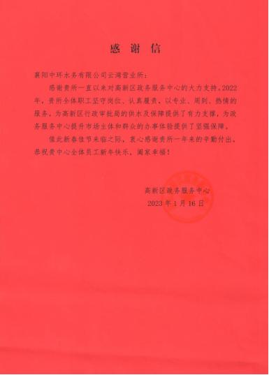 1月20日,襄陽中環(huán)水務(wù)有限公司云灣營業(yè)所收到來自高新區(qū)政務(wù)服務(wù)中心的感謝信,信中對(duì)云灣營業(yè)所2022年展現(xiàn)出的責(zé)任擔(dān)當(dāng),以及沖鋒在前、聞令而動(dòng)的優(yōu)質(zhì)供水服務(wù)給予充分肯定與高度認(rèn)可。